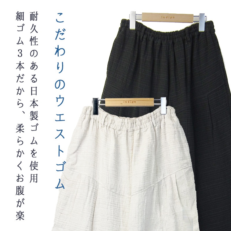 身幅、アームホール大きめ、体型カバー、肌に優しい天然素材、股上深め、ウエストゴムはソフトな日本製の3本ゴムを使用、など【着心地へのこだわり】が随所にございます。