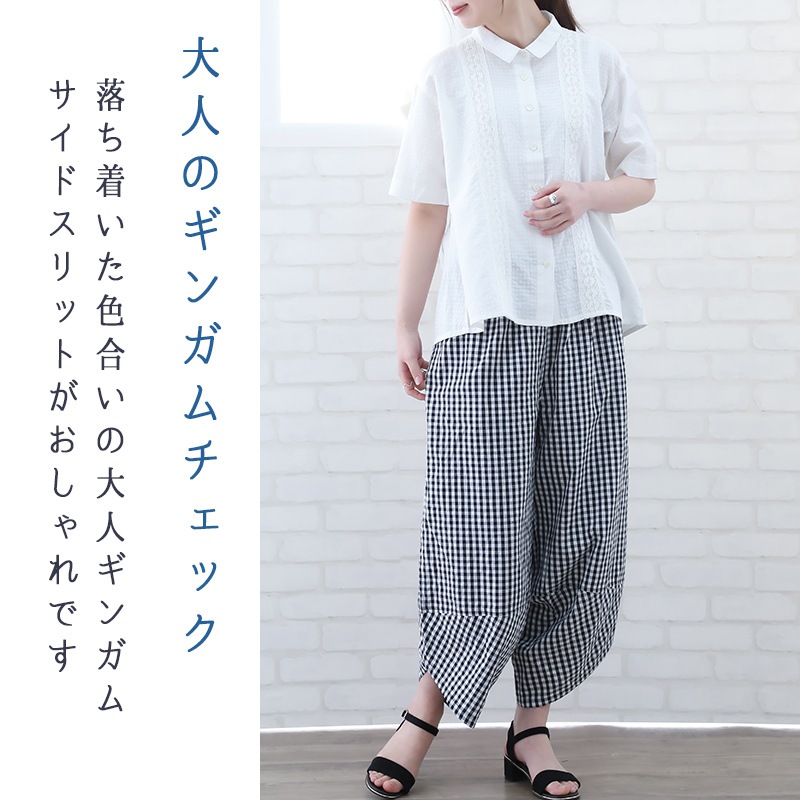 #ワイドパンツ イージーパンツ ズボン チェック おしゃれ 家庭洗濯 綿100% コットン フリーサイズ LL 大きいサイズ